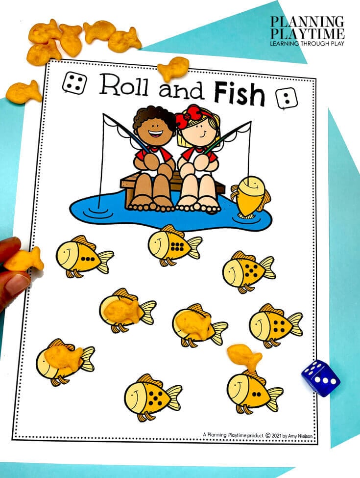 We love snack-tivities! Roll a set of dice, count the number rolled and find that fish in the pond. Place a fish cracker over the fish.