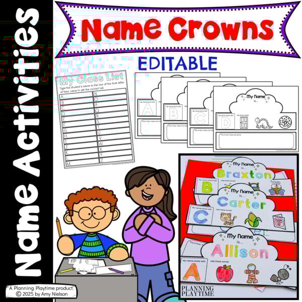 Perfect for back to school, alphabet review, or classroom celebrations — each crown helps children connect the first letter of their name with the beginning sound through matching pictures, writing, and creative fine motor fun.
