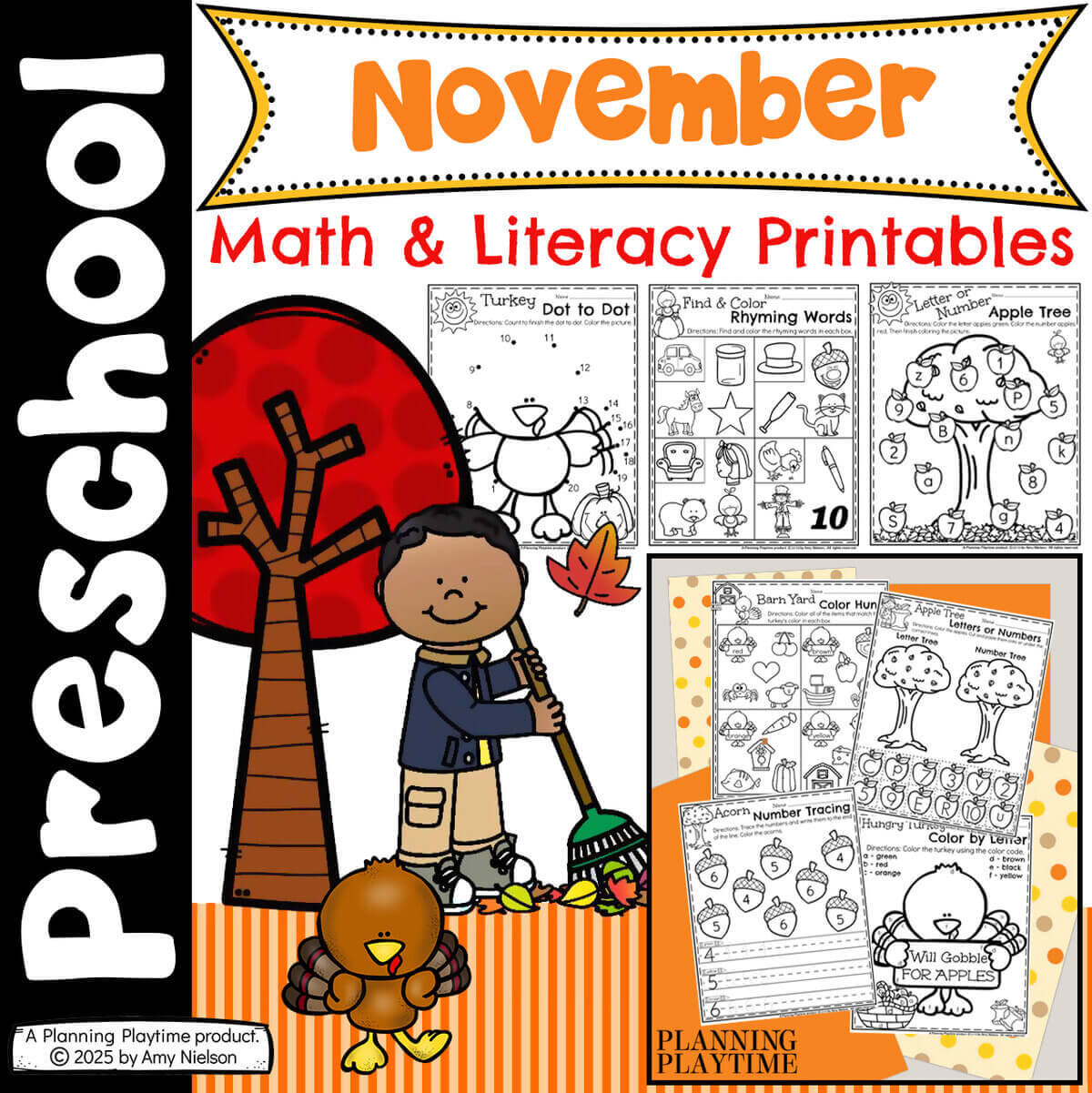 Learn and practice preschool skills in fun, fall and Thanksgiving turkey themes. Use these fun NO-Prep printables for cutting and tracing practice, centers, free choice options, or optional take home work.