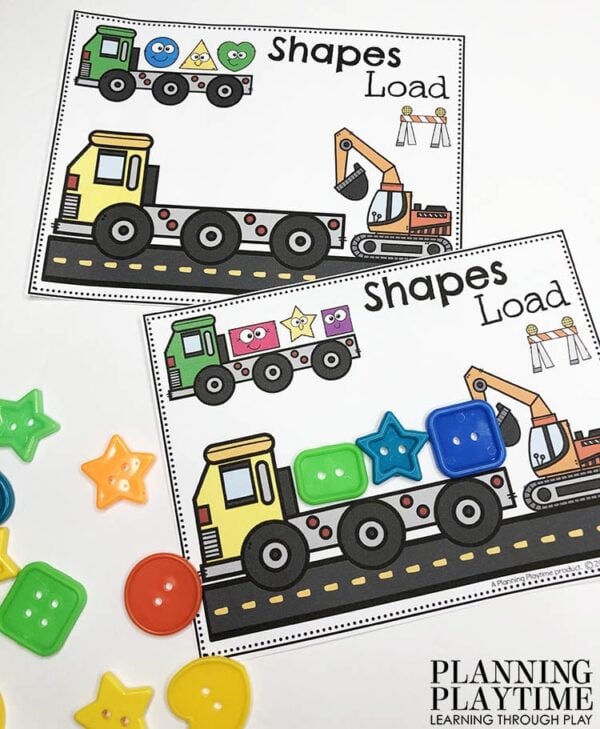 Use shape buttons to copy the different shape patterns. Add a toy truck for fun to drive the shapes off when finished.